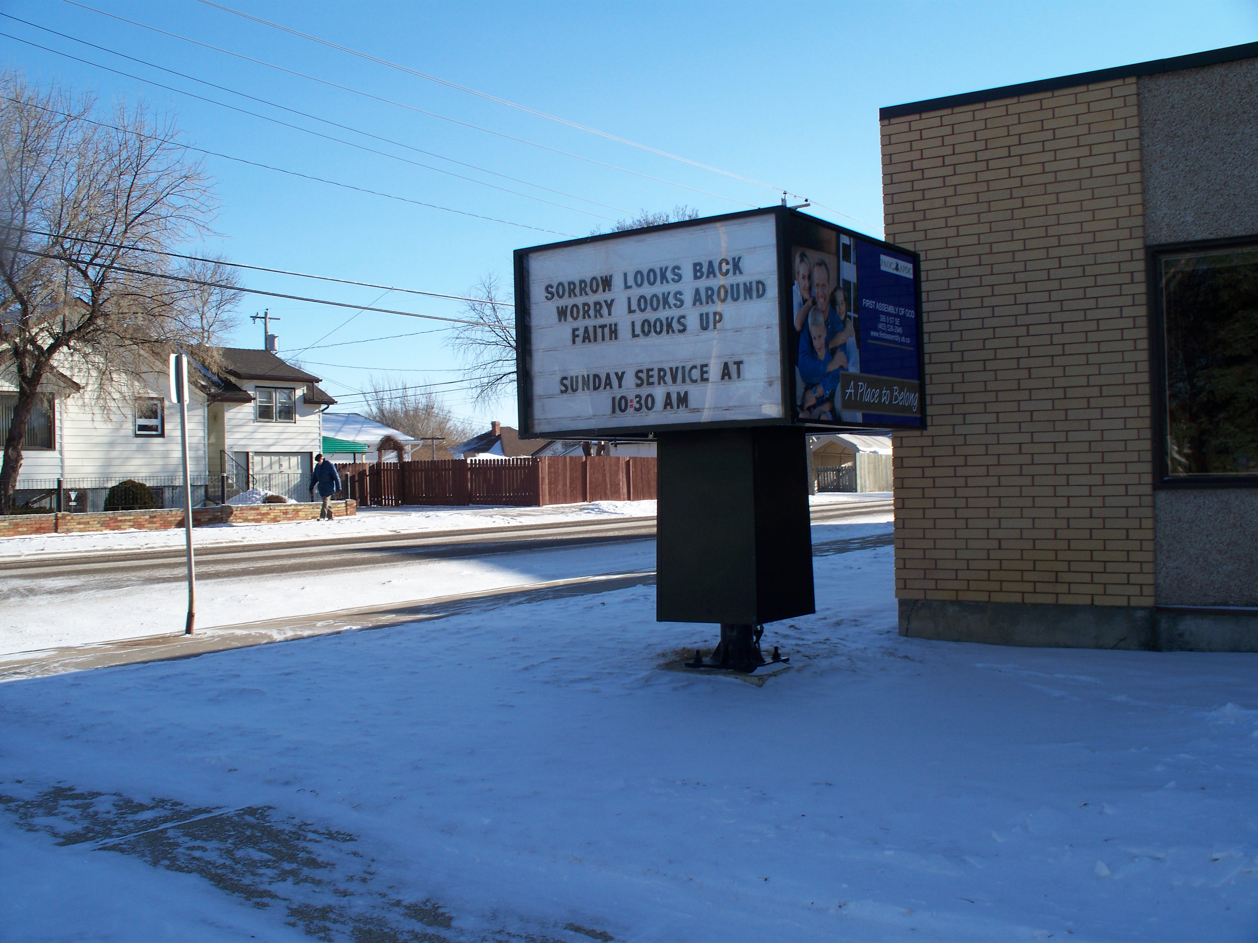 Photograph of a church sign taken 25 Jan 2008 at the Medicine Hat First Assembly of God. Image is unaltered except for cropping and file size reduction for easy display. Original full image (2 meg) is here.