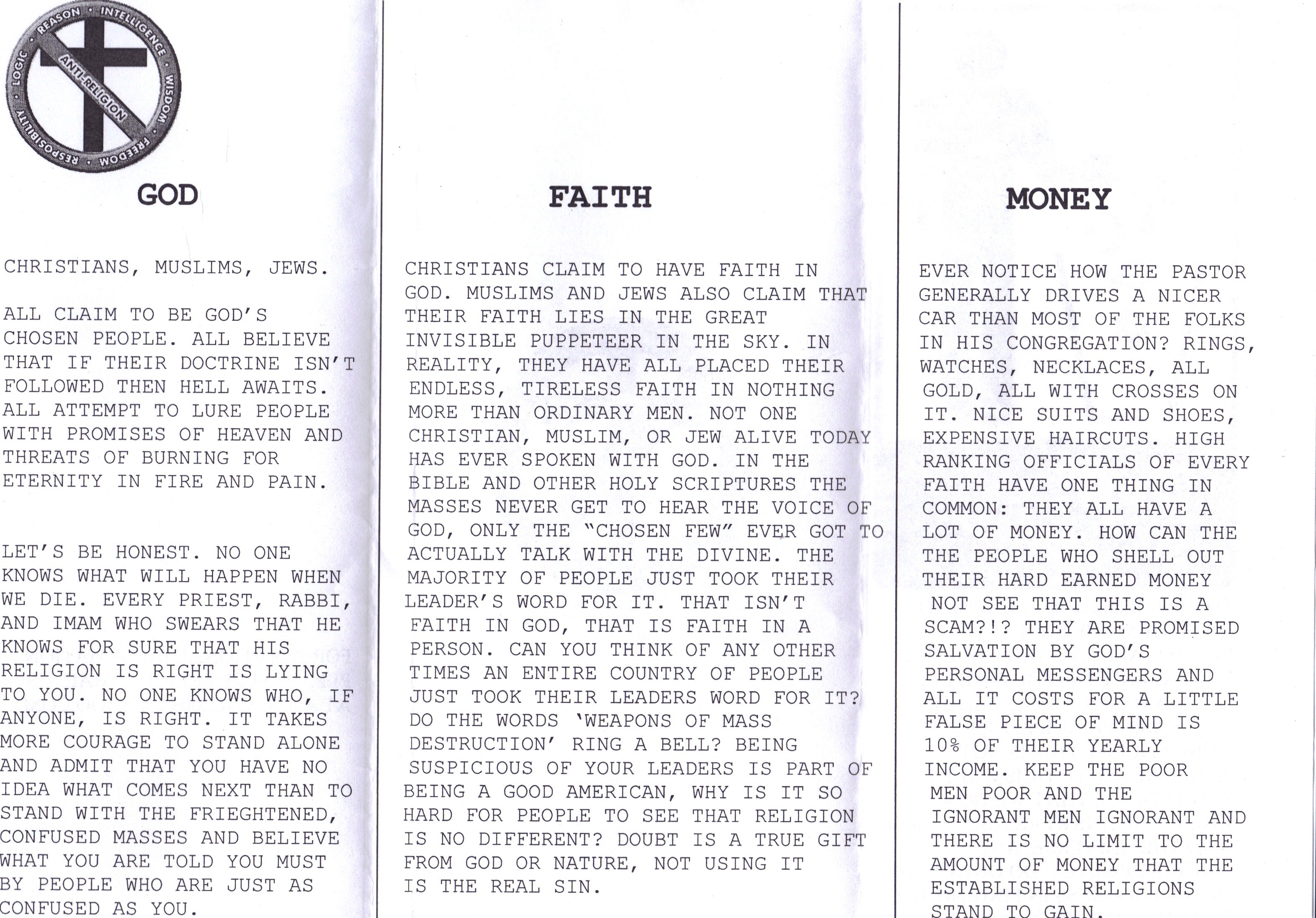 I’m on active duty military, and live in southern Virginia. I am surrounded by REAL ignorant people, mostly Protestants; people so closed-minded and stubborn that they will get violent with you if you debate them about Jesus, their lord and savior, who abhorred violence. Every morning in the summer I get little Jesus pamphlets under my windshield wipers where I park out on the street. So I figured screw ’em, and started printing out my own goddamn pamphlets. I put them under people’s windshield wipers. I also print leaflets and hang them up on message boards or stick them in people’s mail boxes. I may send you some. I think of it as guerrilla warfare in a baptist neighborhood.